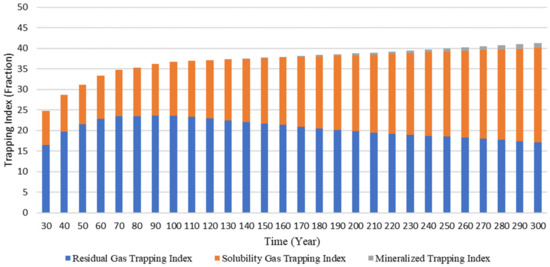Figure 6 describes the change in the CO2 trapping mechanisms throughout time. The trapping mechanisms are expressed in terms of the Residual Gas Trapping Index (RTI), Solubility Gas Trapping Index (STI), and Mineralized Trapping Index (MTI), indicated in fraction. The RTI, STI, and MTI are defined by the following equations [67]: