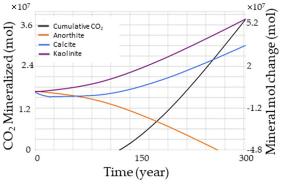 Mineral trapping offers the advantage of an increased storage capacity and CO2 immobilization for a long period [66]. Even though mineralization takes a long time, the trapping process can be sped up by finding optimal parameters, including the system pressure and temperature, brine composition, pH, sweep efficiency, reservoir formation, mineral trapping kinetics, and stress impact on the caprock [68,69,70,71,72]. Figure 7 illustrates the amount of carbon dioxide mineralized throughout time. We considered only three minerals for this study to reduce the computational time: anorthite, calcite, and kaolinite. The chemical reactions for these minerals are as follows: