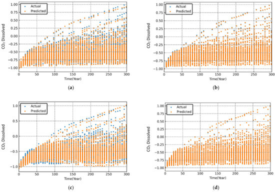 Variation in simulated and predicted dissolved CO2 (normalized) over time for different sets of randomized input parameters. (a) MLP; (b) RF; (c) SVR; (d) XGB.