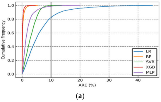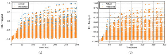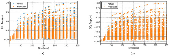 The performance evaluation of each machine learning model was conducted through graphical and statistical error analysis. Figure 9, Figure 10 and Figure 11 present the cross-validated results for dissolved, mineralized, and trapped CO2 (normalized) for different sets of the randomized input parameters. The model was deemed to be highly accurate if the actual and the predicted data points coincided on top of each other. As seen in Figure 9, Figure 10 and Figure 11, both the RF and XGB models had a slightly better performance in predicting the CO2 sequestered compared to the MLP and SVR models.