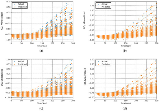 Variation in simulated and predicted mineralized CO2 (normalized) over time for different sets of randomized input parameters. (a) MLP; (b) RF; (c) SVR; (d) XGB.