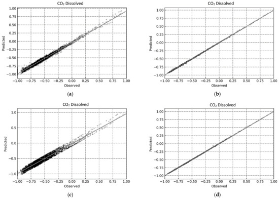 Predicted vs. Observed plots for determining CO2 dissolved using the proposed ML-based models. (a) MLP; (b) RF; (c) SVR; (d) XGB.