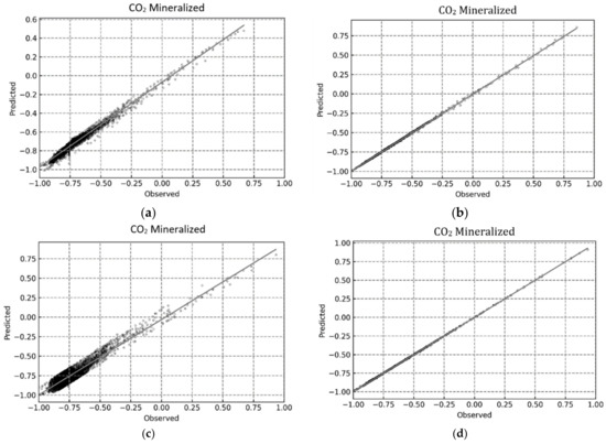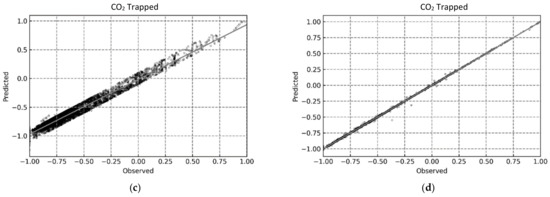 Predicted vs. Observed plots for determining CO2 trapped using the proposed ML-based models. (a) MLP; (b) RF; (c) SVR; (d) XGB.