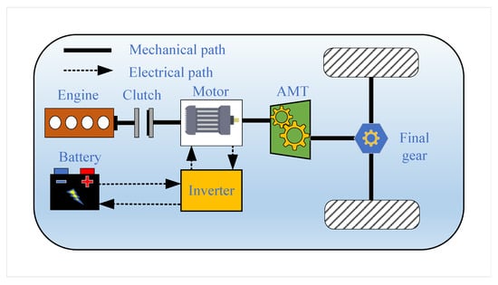 In this paper, the hybrid powertrain structure is shown in Figure 1, which mainly consists of an engine, clutch, motor, battery, and automatic mechanical transmission (AMT). A design in which the engine and electric motor are installed on the same shaft is adopted. In addition, the engagement and disengagement of the clutch allowed for the separate or combined drive of the engine and electric motor. To meet the needs of the vehicle’s drive torque and improve the efficiency of power source transmission, a five-speed AMT was equipped to adjust the torque. Table 1 shows the main parameters of the hybrid powertrain [29].