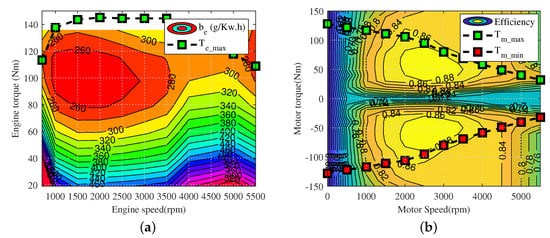 where is the motor power, is the motor speed, and is the motor efficiency; it can be obtained according to the motor efficiency in Figure 2b. When the motor is driving, the motor torque is positive, and when the motor is generating, the motor torque is negative.