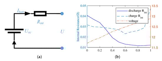 where is the capacity of the battery. Neglecting the effects of battery temperature and battery life on the internal resistance of the battery, the variation of internal resistance with SOC is shown in Figure 3b. According to the Equations (7) and (8), the rate of change of SOC is shown as follows.