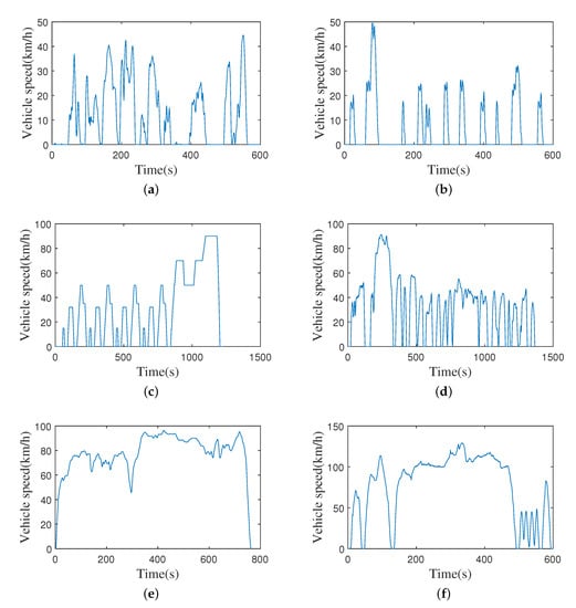 Due to the limitations of the existing experimental conditions and the complexity of the actual vehicle driving condition data, this paper combines the existing European standard driving cycles as analysis samples. According to different traffic conditions and vehicle driving areas, the standard driving cycles can be divided into three categories: urban, suburban, and high-speed. Urban congested road condition refers to the vehicle driving in the center of the city: The traffic flow is large, and road approach congestion leads to frequent vehicle starts and low speed; thus, NYCC and NewYorkBus are selected as the reference driving cycles. The suburban driving cycle means that the vehicle often drives at medium speed with fewer traffic lights; thus, the vehicle stops less often and for a shorter period of time. Therefore, ECE_EUDC_LOW and UDDS are selected as the reference driving cycles. The highway driving cycle refers to the vehicle driving speed being higher than the normal highway, and most of the time, it is at high speed, and the number of stops is lower. Therefore, HWFET and US06 are selected as the reference conditions. The speed curves of each reference driving cycle are shown in Figure 4.