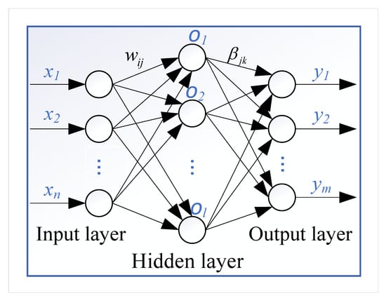 The extreme learning machine (ELM) [31] is a Single-Layer Feedforward Neuron Network (SLFN) that is originally proposed by Guang-Bin Huang, Qin-Yu Zhu, and Chee-Kheong Siew at Nanyang Technological University in 2004 and presented at the IEEE International Joint Conference, and it intends to improve the Backward Propagation (BP) algorithm to improve learning efficiency and to simplify the setting of learning parameters. The standard single hidden layer neural network structure is shown in Figure 6. Specifically, SLFN consists of an input layer, a hidden layer, and an output layer.