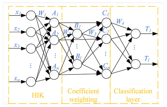 The specific formulation is as follows: first input feature data , which corresponds to the output label features . To avoid random assignments of input weight , the Histogram Intersection Kernel (HIK) function is used to map input data X to ; thus, we have the following: