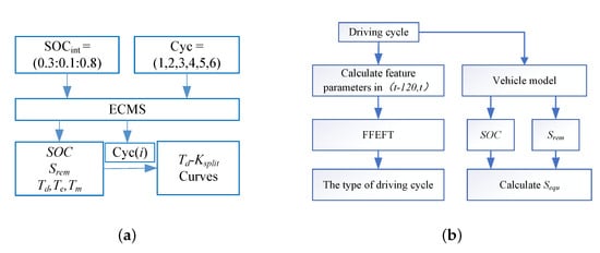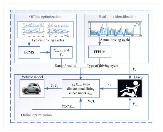 According to previous studies, the initial values of battery SOC before driving, the type of driving conditions, and the driving distance have a great influence on the real-time energy management strategy of the vehicle. Therefore, this paper proposes a real-time energy management strategy that integrates three factors to improve fuel economy. As shown in Figure 8, the proposed strategy is divided into three parts: (1) offline optimization strategy, (2) online optimization strategy, and (3) real-time driving condition identification.