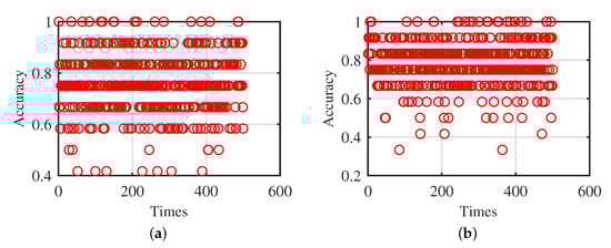 A total of 80 sets of feature data of each typical driving condition block were randomly arranged, with 68 sets of data randomly selected as training data, and ELM and FFELM were used for training. Then, 12 sets of data were randomly selected from 80 sets of data as test data repeatedly. Tests with the trained ELM model and FFELM model and the results are shown in Figure 11. It can be seen from Figure 11a that the accuracy distribution of the test data under ELM is scattered and the accuracy ranges from 0.3 to 1, which is due to the influence of the input weights and biases under random settings. The accuracy of ELM with specific input weights and biases is high for specific test data, but it may be lower or even less than 0.5 for other test data. Therefore, the accuracy under ELM is scattered and unstable. As shown in Figure 11b, the accuracy of the test data under FFELM is mostly greater than 0.7 and is mainly concentrated in the region of 0.8 to 1. The accuracy and stability are better than ELM.