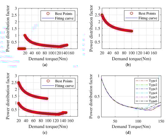 In this paper, ECMS is used for the offline optimization of each typical driving condition. Taking the typical driving condition HWFET as an example, the optimization results are shown in Figure 12 with initial values of SOC of 0.8, 0.4 and 0.3, respectively. When the initial value of SOC is 0.8, battery power is sufficient to sustain the entire distance; thus, there is no need to charge the battery during the acceleration process of the entire distance, and the relationship between the demand torque and the power distribution factor at this time is shown in Figure 12a. When the demand torque is less than 20, the power distribution factor is 0, which means that the vehicle runs on pure electric power when the demand torque is less than 20. When the demand torque is greater than 20, the engine and motor jointly drive the vehicle; thus, the ratio of engine torque to demand torque is less than 1 and greater than 0. The red circled points are the optimal power distribution factor corresponding to the optimized demand torque, and the blue line is the fitted curve. When the initial value of SOC is 0.4, the power is not enough to sustain the entire distance; thus, the entire driving distance needs both battery discharge and battery charge. When battery SOC is less than the battery target value, the battery is charged. Therefore, as shown in the figure, the distribution rate is both less than 1 and greater than 1. When the distribution rate is greater than 1, the vehicle is driven by the engine and the battery is charged at the same time. The red circled points are the optimal power distribution factor under the optimization results, and the blue line is the fitted curve. When the initial value of SOC is 0.3, it cannot run purely on electricity at all; thus, the entire driving process needs to be driven by the engine and the battery needs to be charged at the right time. Therefore, the distribution ratio is always greater than 1. The red circled points are the optimal power distribution factor after optimization, and the blue line is the fitting curve.
