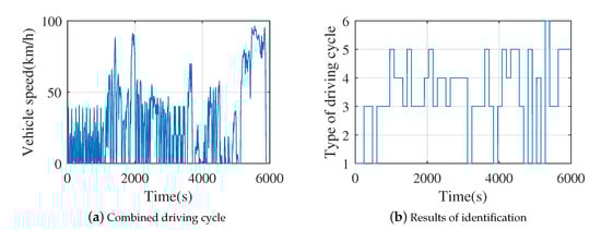 In order to prove the effectiveness of the proposed strategy, the proposed strategy is validated by using a combined driving cycle. The established combined driving cycles are shown in Figure 13a. It consists of six different driving cycles, including urban congestion, urban suburban, and highway conditions. The results of FFEFT identification are shown in Figure 13b. It can be seen that the identification method can effectively identify the type of combined driving conditions.
