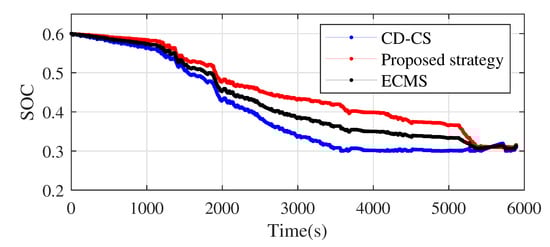 Taking the initial value of SOC as 0.6, the optimization results of the three strategies under the combined driving conditions are shown in Table 6. Compared with the CD-CS strategy, the equivalent fuel consumption under ECMS and the proposed strategy is improved by 8.96% and 10.21%, respectively. Figure 14 shows the trajectory of the SOC under the three strategies during vehicle driving. It can be seen from the figure that the decreasing trend of SOC for the three strategies does not differ much in the first 1000 s. This is due to the fact that the vehicle is driving at a speed less than 40 km/h, the demand torque is not large in urban congested driving conditions, and most of it is in pure electric driving. In time 1000 s to 3500 s, the speed increases from low speed to high speed and then turns to medium speed, and the corresponding torque also increases from small torque to large torque by turning to medium torque. Because the CD-CS strategy is in CD mode with priority battery drive, battery SOC decreases the fastest. ECMS and the proposed strategy are the optimal allocation of engine and motor at each moment, but the proposed strategy decreases slower compared to ECMS because the equivalent distance factor is calculated at any time in the proposed strategy to keep the power limit. From 3500 s to 5000 s, the CD-CS strategy is in the CS mode and SOC keeps fluctuating around the SOC objective. The decreasing trend of SOC under ECMS and the proposed strategy is still similar to the previous paragraph. When the time is longer than 5000 s, the vehicle is mostly driven at high speed, and the required torque increases suddenly; thus, the engine and motor need to drive together, and the motor torque increases, and battery SOC decreases faster.