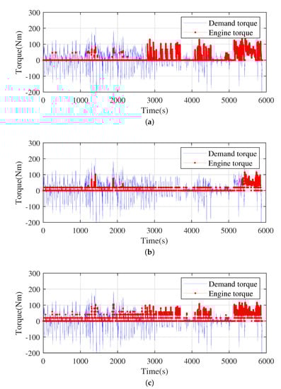 The results of different strategies. (a) The engine torque of CD-CS; (b) the engine torque of ECMS; (c) the engine torque of the proposed strategy.