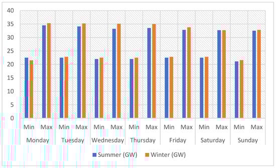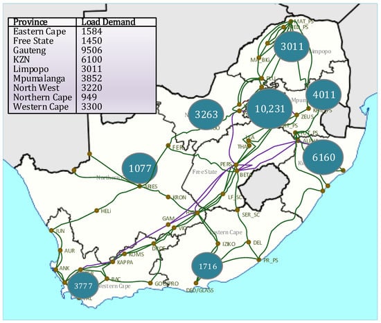 The impact of cold weather during the winter season leaves the entire grid in limbo, causing different transient load demands (see Figure 1). Another finding is the exponential growth rate of the load demands in the country’s central grid. Figure 2 shows the provincial load demands during the peak season, with the Central grid standing at 10,231 MW, followed by the Eastern grid with 6160 MW at the 2017 peak load demand. Additionally, the exponential load growth in the Central grid alone is expected to record an increase of ≈5.2 GW in the year 2028, as published by Eskom in their transmission development plan (TDP 2019–2028), as shown in Table 1 []. While these problems may persist, the investigation into the usage of the MTDC system on this network cannot be overemphasized, as this will bring more knowledge on the reduction of active and reactive powers to losses, improved stability margins and the ease of renewable energy integration. The South African generation capacity is mainly coal-based due to the many coal reserves. Moreover, the plan to integrate an additional power of 17,800 MW of renewable energy by 2030 will require an alternative and efficient means of transmission for this renewable source that is expected to represent about 20% of the country’s installed capacity.