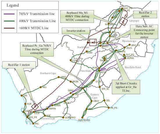 The DC systems are gaining more publicity and are expected to have rapid growth in both the short and long run. Many researchers have compared their mechanisms, structures, topologies and other control measures []. Studies on the leveled cost, expected growth, configurations and deployment are all mentioned in [,]. On power system interarea oscillations, the convectional solution is by careful coordination of the generator’s power system stabilizer and the automatic voltage regulators. Other secondary controllers such as the governor are added for better reliability of these generating plants. Elizondo et al., in [], gave comprehensive literature on the problems arising, from small signal stability to the future trend. On the South African grid, Minnaar et al., in [], recorded different types of faults that occurred along the South African transmission network. They further conducted a reliability check of the grid based on the probabilistic fault performance parameters with respect to the season, time of day and climate. They found that most of the fault on this grid is due to bird streamers, with 38% occurrence, lightning with 26% and fires with 22%. Additionally, in [], Corsi et al. applied a coordinated automatic real-time secondary voltage regulator (SVR) to the South African transmission grid, thereby providing improved power quality and controllability and stability to the grid. The study on the impact of the HVDC link on the South African grid during a three-phase short circuit was further carried out by Mbangula et al. []. This study investigated the rotor angle stability of the South African transmission grid, focusing only on a two-terminal converter technology. Oni et al. discussed the modeling of a multiterminal HVDC (MTDC) system in [] and evaluated the performance analysis using a single machine infinite bus system and four area machine networks in [] and [], respectively. They found out that the MTDC network significantly improves during a system disturbance. However, those studies in the literature did not focus on the impact of a complementary controller on the MTDC link or analyze the dynamic study of the MTDC link on the South African network, especially on the 765-kV corridor. Additionally, there is limited literature on the analysis of this 765-kV corridor of the Eskom South grid. Besides, the current Line Commutated Converter (LCC) HVDC on Eskom is a ±533 kV Cahora Bassa HVDC link; therefore, it will be a novel contribution to the body of knowledge to analyze this transmission network with the usage of a MTDC scheme. Another contribution is the implementation of a complementary controller for better damping of the oscillations during fault on the AC grid.