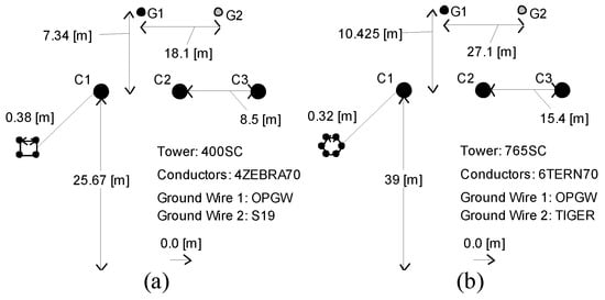 Tower geometry for the overhead lines: (a) 400-kV geometry and (b) 765-kV geometry.