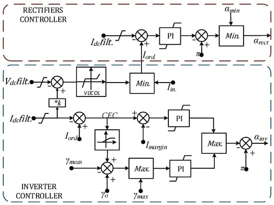 The rectifier side of the LCC_HVDC system is controlled using the current control strategy, as shown in Figure 7. The rectifier controls the current on the DC side. The VDCOL is employed to limit the DC current order. The DC current deviation between the DC current order and the DC filter current is used to generate the rectifier’s adjustment signal, i.e., firing angle. The control principle of the rectifier controller is derived as
