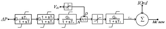 To improve the performance of the DC power controller, a supplementary (auxiliary) controller is proposed. The proposed controller uses the measured deviation of the AC side’s active power to generate a new current reference for the rectifier and inverter of the LCC-HVDC system, as shown in Figure 8. The control principle of the auxiliary control is based on the fourth-order lead–lag compensator that is derived as