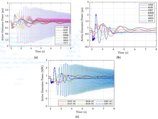 The dynamic stability response of the network with and without the MTDC network is given in Figure 10, Figure 11, Figure 12, Figure 13, Figure 14, Figure 15 and Figure 16. Figure 10a,b depict the generator active power plots without and with a MTDC link. Each generator power supply is represented on a per unit (pu) scale on these plots. The combination of both scenarios is shown in Figure 10c. The GRT_PS is already out of step on this plot, with its active power swinging between ≈±2 pu values. The results in Figure 12a with GRT_PS, a generating plant at the North-East grid, has proximity to the short circuit’s fault. Thus, the generator loses synchronism during the first swing. Since a disturbance applied to the network has the critical clearing time of the system, the results showed that, following the disturbance, the first swing in the rated active power in the line has a larger amplitude of 2 pu. However, other generating plants were able to maintain stability with a very poor damping factor causing an interarea oscillation, especially at the Western grid. This impact can be observed in the oscillations shown in Figure 11a. However, following the same disturbance with the MTDC system, the results in Figure 11b show that positive damping has been added to the generators’ oscillations on the network. Therefore, implementing the MTDC model on the grid provided a better performance than the first case study. MAT_PS and GRT_PS with the worst post-fault conditions were able to maintain a stable operating point after the third cycle.