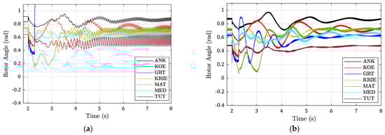 Figure 11a,b show the generator rotor angle (δ) dynamics in radian. In Figure 11a, the GRT_PS synchronous generator was out of step from the rest of the synchronous machine. It recorded a rapid increase in the rotor angle, while other generators witnessed a steady increase with the continuous oscillation.