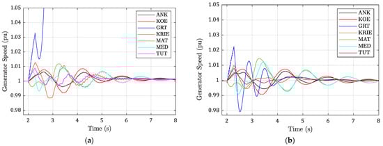 The generator angular speed response is shown in Figure 12a,b. In the first plot (without the MTDC link), GRT_PS recorded a sharp angular acceleration up to 1.033 pu at the time t = 2.34. The generator’s post-fault condition experienced unexpanded kinetic energy, resulting in a continuous increase of the rotor speed and, thus, led to a loss of synchronism. Other generators were in stable condition but with insufficient damping torque. Figure 12b shows a better generator speed with quickly damped oscillations. The rotor angle eventually settled on a normalized new reference value. However, MAT_PS and MED_PS had the worst post-fault conditions.