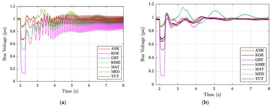 A specific busbar was selected and monitored for voltage profile variation. Figure 13a,b show this voltage profile without and with the MTDC link, respectively. GRT bus has the lowest dip of 0.16 pu in Figure 13a,b. These dips occurred due to high fault impedance generated from the fault proximity. It is followed by KRIE bus and TUT bus, accordingly. Additionally, the system without the inclusion of MTDC in Figure 13a experienced high-voltage oscillations between the range of 0.7–1.1 pu. The dynamic voltage response in Figure 13b with the implementation of the MTDC link shows a steady and stable post-fault condition. However, the MED busbar recorded the worst post-voltage profile due to the high impedance of the line from the generator to the load.