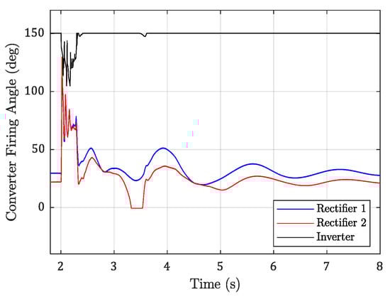 Finally, the firing angle for the converters is shown in Figure 14. The pre-fault values were 29.75°, 21.97° and 150.21° for rectifier 1, rectifier 2 and the inverter station, respectively. Additionally, the DC power is shown in Figure 15 following a three-phase short-circuit fault on the Gr_He transmission line. The plot shows the converters’ DC power with and without a supplementary controller. This analysis evaluated the contributional impact of the supplementary controller on the active power transfer across the multiterminal converters. At simulation time t = 2 s, the power transfer dips to −8 MW, meaning a reverse transfer into the rectifier link. However, with the VDCOL, the corresponding lower voltage of 0.1 pu is selected, reducing the excessive fault current transfer into the inverter station.