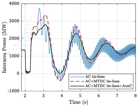 Figure 16 shows the interarea power transfer between the transmission line linking the North-East and the Central grids. The transmission lines considered for the first scenario are Merc_Herm, Merc_Mid and Grt_Hera. In contrast, during the second scenario, the interarea power transfer corresponds to the power across the AC lines (Merc_Herm, Merc_Mid and Grt_Hera), plus the DC power across the rectifier 1 station. This plot shows the impact of the negatively damped torque (Td) during the first scenario. With very poor damping, the active power underwent a post-fault harmonic and was thus unable to meet the steady operating condition. The implementation of the MTDC link provided an enhancement in the damping of the interarea power oscillations, as the network recorded a significant positive damping torque, thus providing a more stable post-fault condition. The impact of the supplementary controller on the damping of the interarea power during the disturbance is also shown on this plot.