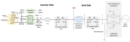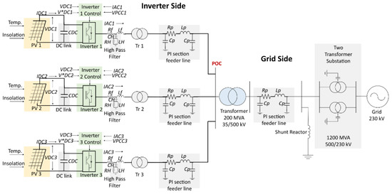 As illustrated in Figure 2, the grid-connected solar PV system I includes the grid side and solar inverter side. At the grid side, the 35 kV point of connection (POC) is connected to the 200 MVA main power transformer interfacing with the grid through the transmission line and step-up substation. The system transformer steps down the transmission voltage (i.e., 500 kV) to a medium voltage level (i.e., 35 kV). The transmission line also features a 225 MVAR shunt reactor acting as a reactive compensation device. The substation consists of two 1200 MVA main power transformers. The reactive compensation device and parameters for the transmission line and transformers were modeled to simulate a realistic environment that matches a system seen in the real-world to provide convincing and credible results. The grid was modeled as a standard voltage source with an impedance to account for a synchronous generator. Table 1 presents the component parameters for the grid side in this solar PV test system.