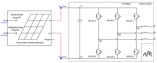 At inverter side, a single solar PV inverter was connected to the transmission POC bus through a 3 MVA step-up transformer (Tr 1 shown in Figure 2) and a PI-section feeder line. This transformer has a scaling function that scales the current as it steps up the voltage to increase the power output of the solar farm from 1.75 MW to 70 MW. As illustrated in Figure 3, the solar PV consists of a PV array that generates 1.75 MW peak power, a DC-link capacitor to stabilize the voltage, and a DC/AC inverter with control functions. Figure 3 also shows the solar PV inverter, which was modeled by a two-level voltage source converter (VSC) and a DC-link capacitor. Each of the six switches in the VSC connects one of the three phases to one of the DC terminals. The switches in each leg are switched alternatively using the sinusoidal pulse width modulation technique, where the sinusoidal reference signal is compared with a fixed frequency triangular waveform to create this switching pattern. The detailed inverter model also houses an AC reactor used to filter any undesired harmonics in the system. A snubber circuit was modeled inside of the inverter model, which limits the switching voltage amplitude and its rise rate and reduces power dissipation from the inverter. The snubber circuit consists of a series capacitor and a series resistor connected with a thyristor in parallel. On the AC side terminals of the inverter, there is a high-pass RC filter capable of filtering out transients from both the grid and the inverter AC side terminals. The parameters for the solar PV array and the inverter are shown in Table 2.