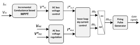 As shown in Figure 4, the solar PV inverter has generic control schemes as well as blocking and de-blocking functions. For the outer loop control, the reference value for the DC bus voltage control (V*DC) was generated through incremental conductance-based maximum power point tracking (MPPT) algorithm, and phase-locked loop (PLL)-based measurements from the grid were used as input for the AC bus voltage control. These outer-loop voltage controls generate d-axis and q-axis reference currents for the inner-current loop. The inner-current loop outputs the modulation index, which is later converted into abc form using dq0 to abc conversion to input into the firing pulse generators. The generators provide gate signals to the inverter with a switching frequency of 2 kHz. In addition, the detailed inverter model includes blocking and de-blocking functions in response to the low-voltage dynamics during fault conditions. Inverter blocking is the function that the inverter is connected to the grid but ceases to output any current when the inverter terminal voltage at the point of common coupling falls below a certain level; inverter de-blocking is the function that inverter reinjects current after a reset delay time when the terminal voltage returns to a nominal value. The fixed time delay was set so that when the current starts to reinject into the system, the system should mostly be back to stability [25].