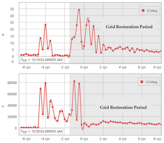 By comparing Figure 6 with Figure 9, it can be observed that the magnitude of the negative-sequence current during the restoration period increased with the number of solar PV inverters. As shown in Figure 6, the peak value of the negative-sequence magnitude during the restoration period was 35 amps, but Figure 9 shows that the peak value of the negative-sequence current magnitude reached 100 amps, which is almost 3 times higher than 35 amps as shown in Figure 6. The interaction between additional inverters and the power network in solar PV test system II causes the increasing peak value of the negative-sequence current magnitude during the restoration period following a grid disturbance.