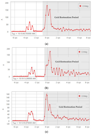 By comparing Figure 10 with Figure 11a–c, it can be observed that the single line-to-ground fault causes the most severe negative-sequence current during the grid restoration period relative to the other types of faults. As shown in Figure 11a, the single line-to-ground fault caused the negative-sequence current magnitude during the grid restoration period to peak around 180 amps, which is higher than 140 amps induced by the three-phase fault as shown in Figure 10. In Figure 11b, the double line-to-ground fault caused the negative-sequence current magnitude during the grid restoration period to peak around 170 amps while in Figure 11c, 160 amps induced by the line-to-line fault, which are both larger than the three-phase fault as well. The unbalanced faults presented in Figure 11 will naturally have a higher magnitude of negative-sequence current due to their unbalanced nature, especially when compared with balanced fault types like the three-phase fault in Figure 10.