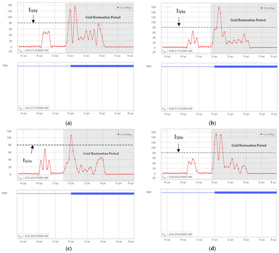 Figure 12a–d show the amplitude of the negative-sequence current measured by the SEL relay and the 50Q trip signals measured at POC bus in solar PV system II under weak grid conditions following the different types of faults. Figure 12a presents the case where a three-phase fault is applied to the grid, Figure 12b presents the case where a single line-to-ground fault is applied to the grid, Figure 12c presents the case where a double line-to-ground fault is applied to the grid, and Figure 12d presents the case where a line-to-line fault is applied to the grid. As shown in the figures, during the grid restoration period, the peak values of the measured negative-sequence fault currents were 135 amps under the three-phase fault, 165 amps under the single line-to-ground fault, 110 amps under the double line-to-ground fault, and 155 amps under the line-to-line fault, respectively. Under each type of fault, the amplitude of the peak negative-sequence current injected from the solar inverters during the grid restoration period is larger than the negative-sequence pickup current I2pkp, and 50Q element picks up successfully. After the 50Q element picks up, it sends the trip signal from the relay, which is why the negative-sequence current suddenly becomes zero in each of the cases. This example suggests that solar inverters adversely impact the operation of the 50Q element during the grid restoration period, after the fault is cleared at the grid side. Given that 50Q element is commonly used in conjunction with other protective elements such as a fault detector scheme supervising directional negative-sequence elements [26], time overcurrent relays, and distance relays which use negative-sequence current for remote backup protection [28], maloperation of these elements may pose a risk to the reliability of the power system.