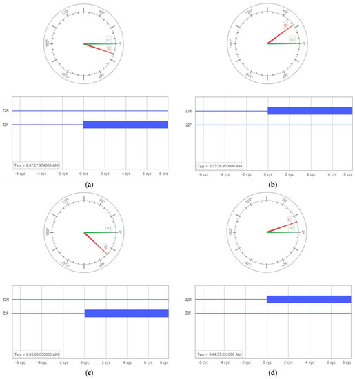 Figure 14a–d shows the oscillography data of negative-sequence current and voltage phasors and relay trip signal for 67Q element measured at POC bus in solar PV system II under weak-grid conditions following different types of faults at the grid. More specifically, Figure 14a presents the case where a three-phase fault is applied, Figure 14b presents the case where a single line-to-ground fault is applied, Figure 14c presents the case where a double line-to-ground fault is applied, and Figure 14d presents the case where a line-to-line fault is applied. The phase angle is measured after the fault has cleared during the grid restoration period, I2 and V2 stand for the amplitudes of the negative-sequence current and voltage, and Z2F and Z2R represent the forward and reverse direction trip signals, respectively. If the forward and reverse direction signals are activated, the relay detects a fault, sends a trip signal, and thus provides a direction for that fault. For example, as shown in Figure 14a, under the three-phase fault, the relay sees a phase angle difference of approximately 19 degrees with V2 leading I2 and subsequently the relay sends the forward direction trip command. The trip operation is also successful under the other three types of faults as shown in Figure 14b–d, where the apparent V2 lags I2 by about −35 degrees for the single line-to-ground fault, the apparent V2 leads I2 by about 44 degrees for the double line-to-ground fault, and the apparent V2 lags I2 by about −20 degrees for the line-to-line fault. Under each type of these faults, the element mistakenly declares there is a fault, provides a fault direction, and operates this relay during the restoration period, even after the fault at the grid side is cleared.