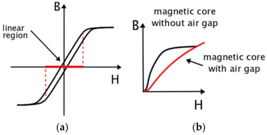 Electronic transformers using the Hall effect can be classified according to their feedback loop designs into open and closed loops. Open-loop transducers utilize the elemental application of the Hall effect. They ensure the most cost-effective solutions for current measurements with low power consumption, where the size and weight are reduced compared to the inductive CT. The primary winding of this transducer generates a magnetic field, which is concentrated by a magnetic core. The Hall sensor is used to detect the magnetic flux density and is placed in the air gap of the catted magnetic core. The differential gain and control current are provided by electronics in the transducer. If there is a linear relationship between magnetic flux density B and magnetic field strength H of the magnetic core, then the magnetic flux density B is proportional to the number of turns of the primary winding multiplied by the RMS value of the current flow in this winding. Moreover, regarding the magnetic flux density B, the Hall voltage is also proportional. Considering this and the Hall offset voltage, the instantaneous output voltage from the Hall sensor is proportional to the instantaneous value of the primary current. However, due to the nonlinearity of the magnetic core magnetization characteristics B–H, some deterioration of the transformation accuracy may occur. In Figure 1b, the theoretical nonlinear magnetization curves are shown for the magnetic core with and without the air gap for the Hall sensor.