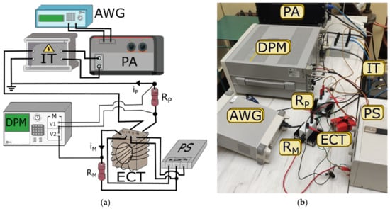 The measuring system is supplied by the power amplifier (PA) controlled by the arbitrary waveform generator (AWG). This allows to smoothly adjust the RMS values of the higher harmonics and their phase angles. The insulation transformers are used to ensure galvanic separation of the power amplifier and supplied circuit. Moreover, the ground potential level of a selected terminal can be forced. In the measuring circuit, the tested ECT has additional primary windings with 50 turns. The rated primary current of this winding is equal to 2 A. The resistance of the current shunt RP is equal to 1 Ω, while the resistance of the current shunt RM is equal to 100 Ω, where the rated output current is 20 mA. The rated voltage of both shunts equals 2 V. The differential voltage is measured between both shunts using differential channels of the DPM. Moreover, to determine current errors and phase displacements of the tested CT, the measurement of the voltage on the current shunt RP is required. Therefore, considering the resistance of the used current shunts, the composite error can be determined from the equation: