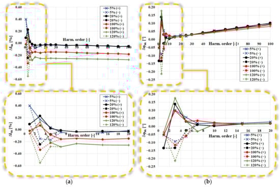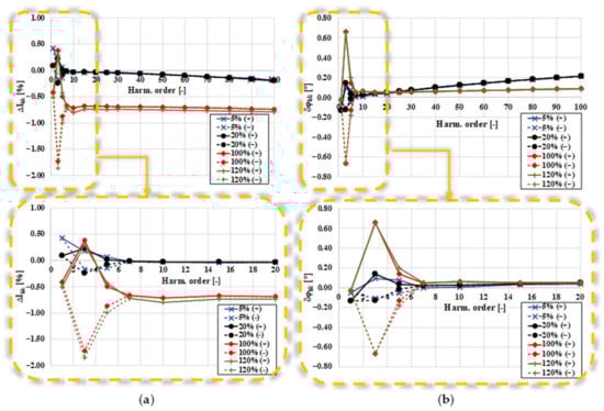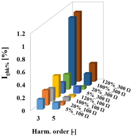 The increase in the output load of the ECT caused the increase of the Is current (Figure 2) and an increase in the values of the current error. Moreover, the self-generation of the low-order higher harmonics also increased. These changes resulted from the increase of the magnetizing flux in the magnetic core of the ECT. This caused movement of the ECT operating point on the magnetization characteristic (Figure 1b), closer to saturation, where nonlinearity is higher. This behavior is similar to what is widely used in power grid inductive CTs [21]. To present a clearer self-generation phenomenon of the ECT, the percentage values of the third and fifth low-order higher harmonics are presented in Figure 7. The calculations were performed according to the method presented in [30].