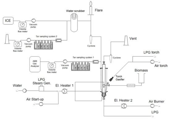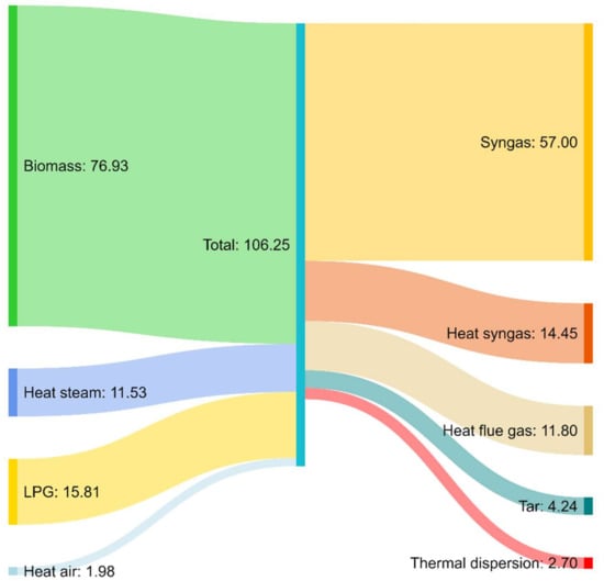 For the energy balance, except for the energy contents of biomass, LPG, syngas, and tar, the energies/time required for pre-heating the input flows (air and steam) and the residual heat content of the output flows were considered. In particular, air and steam were introduced in the gasifier at approximately 200 °C; the syngas exits the gasifier at around 800 °C, as measured in the freeboard, and the flue gas exits the combustion chamber at 850 °C. For the energy balance, the higher heating values (HHV) were considered, and the residual heat of the output streams were calculated, reporting the products to 25 °C.