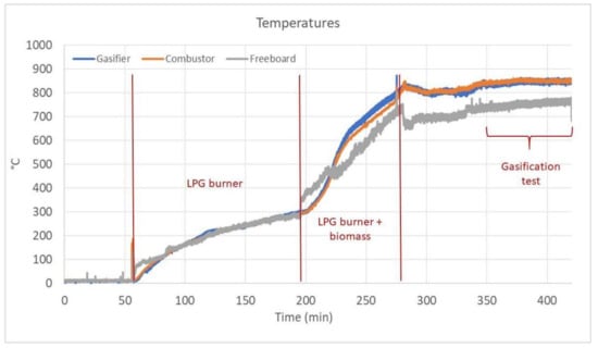 Once the temperature level of 300 °C was reached, biomass is also added to the gasifier, in order to contribute to the temperature increase by combustion. Biomass is fed at a flow rate of 10 kg/h, corresponding to about 50 kW of thermal power input. This phase is reported in Figure 5, between minute 200 and 280, when it is possible to observe a considerably higher slope of the temperature increase versus time, compared to the previous phase. In this phase, the heating rate is about 6.5 °C/min. While the temperature in the reactor increases, the air flow rate to the gasifier is gradually decreased, in order to reduce the production rate of heat required for the reactor pre-heating, however, still keeping the bed in bubbling fluidization regime.