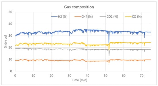 Figure 6 shows that the gas composition is approximately constant during the 75 min of the test, meaning that the gasification process reached the steady state. H2 content in the fuel gas is around 35%.
