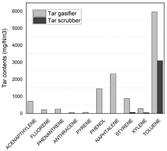 The tar content at the outlet of the gasifier, obtained in the test described in the previous section, was compared with the tar content obtained downstream the water scrubber. The comparison of tar contents is reported in Figure 7.