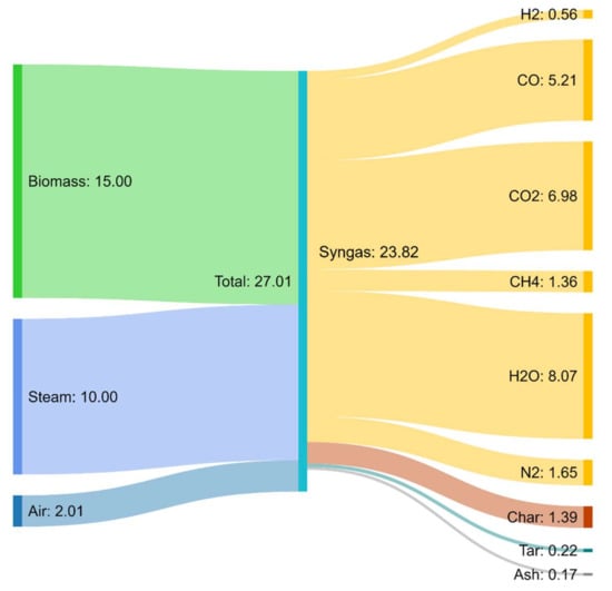 Figure 8 shows that the mass balance on the gasifier is closed with a very small error (around 4%), with the above assumptions dictated by previous experimental evidence [8]. This error can be further reduced if the light hydrocarbons would be also considered in the mass balance. These light hydrocarbons are certainly in the syngas, with a concentration between 2 to 5%, as reported in the work of Larsson et al. [13]. It is possible to observe that humid syngas represents the most abundant of the outputs, accounting for 93% of the total products. Tar and ash account for less than 1% of the total products; char is 5.5% of the total output of the gasifier and it is assumed as a mass and energy input for the combustion reactor.