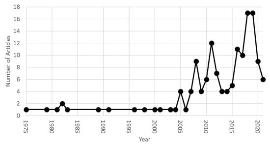 Trend of the number of articles published from 1975 to 2021. Note: The horizontal axis represents the publication year. The figure for 2021 is only for January.