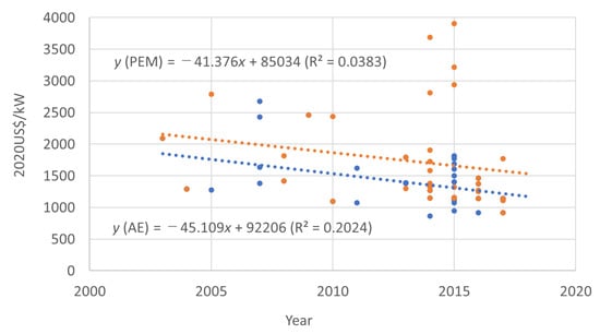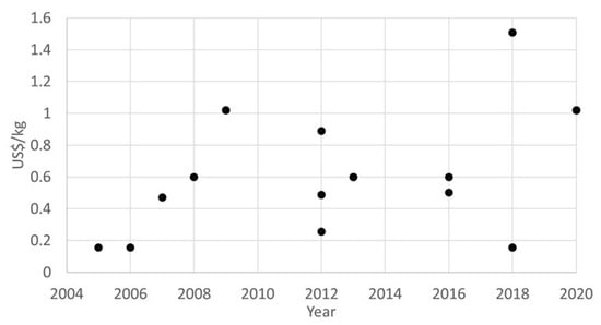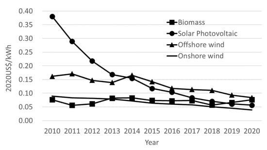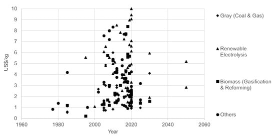 Therefore, we decided to narrow down the focus to hydrogen production costs with different technologies, along with the year of publication of the study. With increased awareness of carbon emission reductions, the number of published articles can only increase with time. Until recently, renewable electricity was more expensive than other generation technologies; therefore, renewable electrolysis technology has been ignored in the research on hydrogen mass production of hydrogen, while incumbent hydrocarbon or coal- and gas-based hydrogen have been intensively discussed. However, the cost of hydrogen production is likely to reduce over time, regardless of the technologies applied.