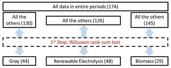 We performed non-parametric tests (Kruskal–Wallis rank-sum test and Wilcoxon rank-sum test) in four steps. Note that these tests sort the cost forecasts from cheaper to higher (more expensive) ones and provide them with sequential ranks. Thus, for example, a cost ranked 10 is cheaper than that ranked 100. First, we applied the Wilcoxon rank-sum test to the production cost forecast of each production method (i.e., gray, renewable electrolysis, and biomass) by comparing them with all other categories over the full period to allow us to examine whether the production cost of each method was statistically different from the others (see Figure 3).