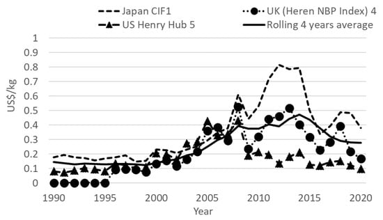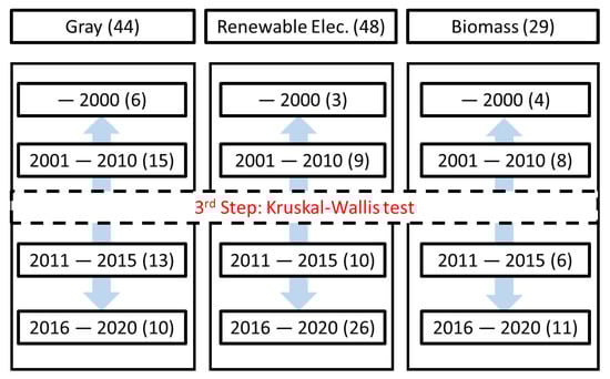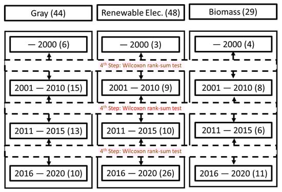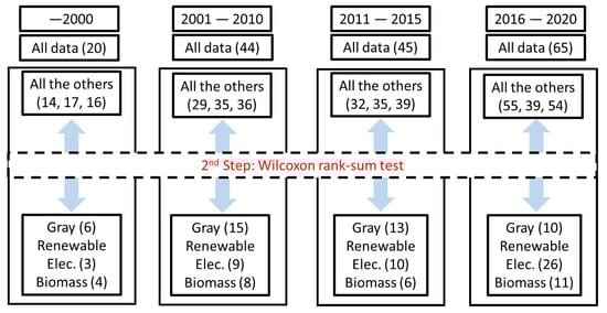 In the second step, we conducted the Wilcoxon rank-sum test, as in the first step, but for different groups of the years of publication (before 2000, 2001–2010, 2011–2015, and 2016–2020), to compare the changes in the costs over time. It is ideal to compare the cost data not only in publication years, but also in combination with the forecast years and regions in the second step, as the production costs of gray and renewable electrolysis hydrogen are highly dependent on forecast years and regions, and whether cheap gas, coal, or renewable electricity are available, which vary according to region. However, the 174 data samples are not sufficient to analyze fragmented categories with combinations of forecast years and regions. Therefore, as Figure 4 shows, this study focused on publication years, recognizing the limitation that there are no segregations of forecast years and regions in the same categories of the publication year ranges (before 2000, 2001–2010, 2011–2015, and 2016–2020).