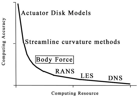 Figure 3 briefly shows the demand on the computational accuracy versus the computer resources for different levels of numerical techniques [17]. It is obvious that the improved body force model can be relatively independent of the empiricism and cost much less computer resources than the RANS model within a proper accuracy range [18]. Below, the RANS model and improved body force model were used to simulate the flow field performances of Rotor 37. Compared with the experimental data, the results were analyzed to further validate the accuracy of the improved body force model.